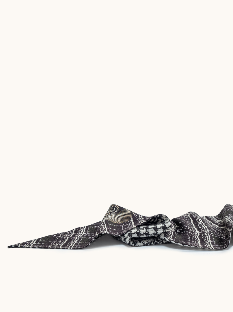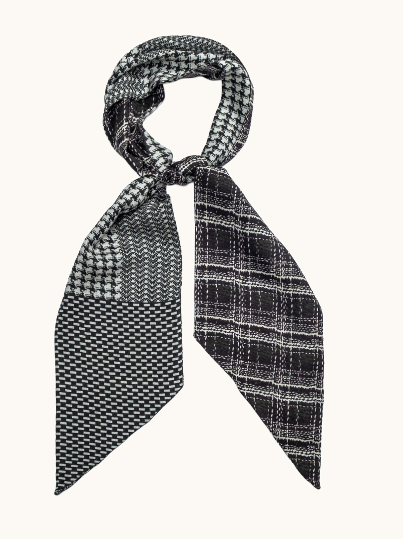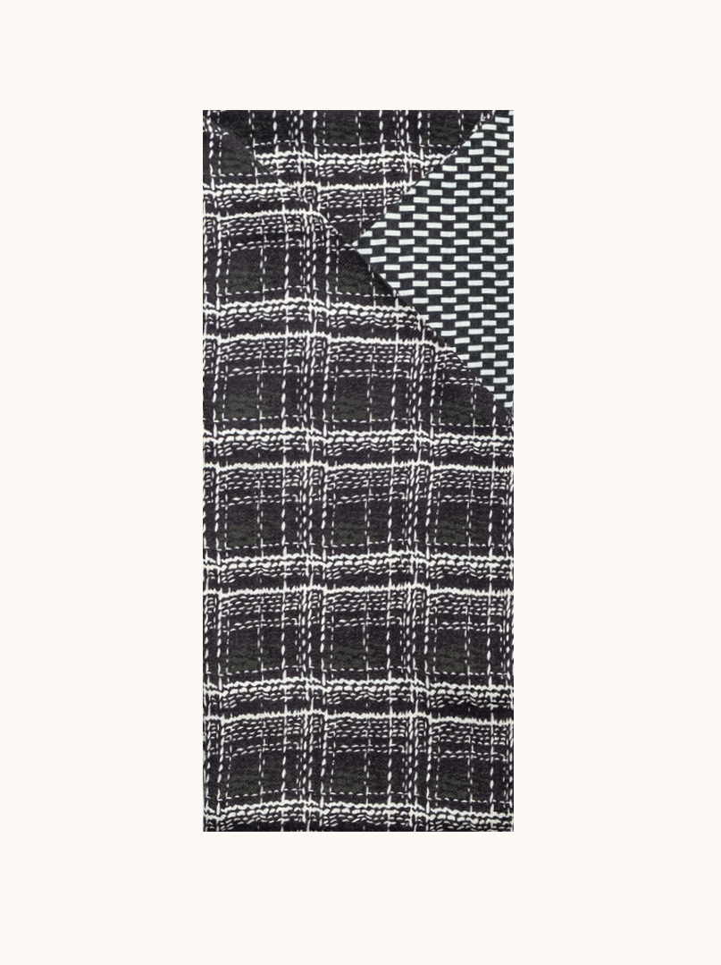 Ten szal to nowoczesna interpretacja klasyki , gra kontrastów czerni i bieli oraz zestawienie różnych, graficznych wzorów tworzą efekt wyrafinowany, ale nieoczywisty. To design, który przyciąga uwagę detalem, a jednocześnie pozostaje spójny i minimalistyczny.
