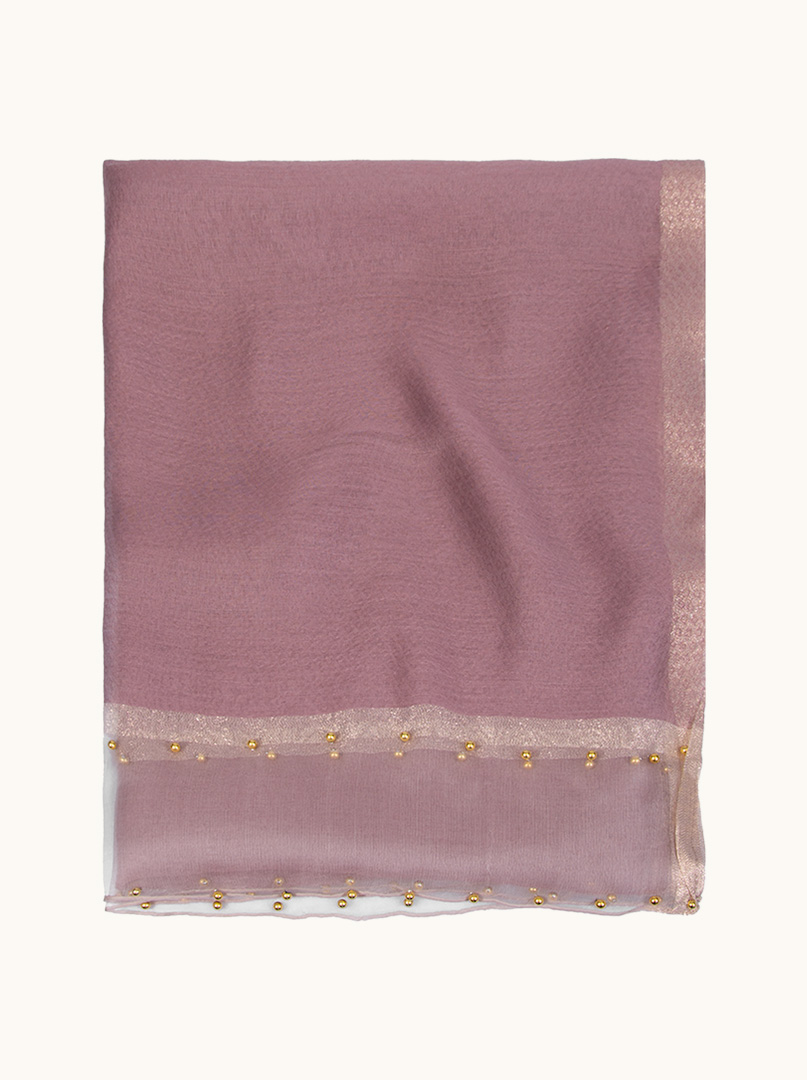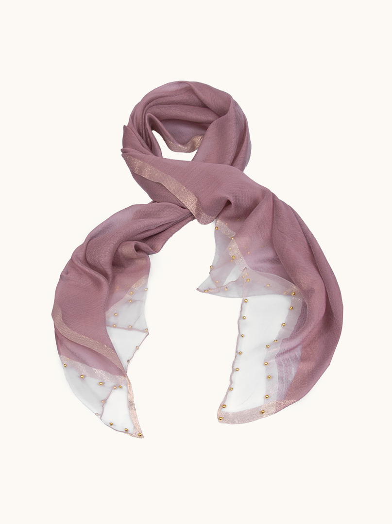 Ten piękny szal został wykonany z wysokiej jakości materiałów, które zapewniają nie tylko miękkość i delikatność, ale także trwałość. Jego fioletowy kolor dodaje nuty romantyzmu, podczas gdy złota obwódka i koraliki nadaje mu luksusowego wyglądu.