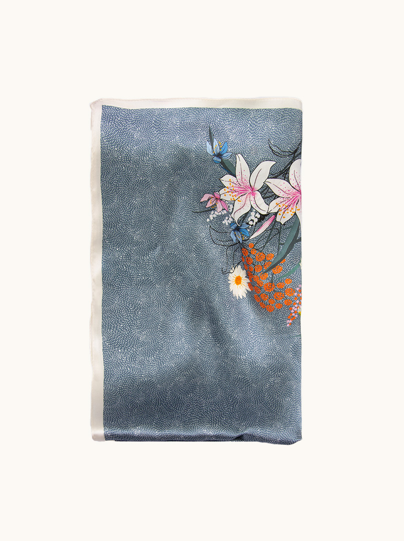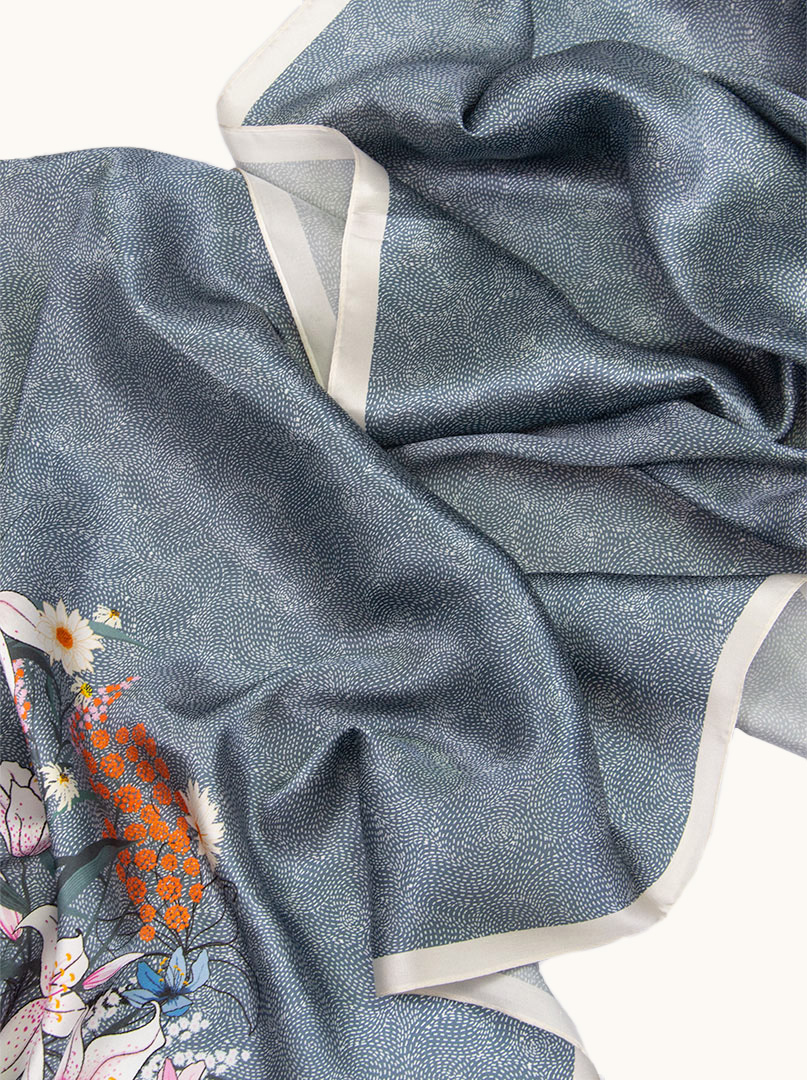 Subtelny, ale z charakterem. Ten szal to definicja nowoczesnej elegancji – granatowa baza spotyka się tu z artystycznym, lekko orientalnym motywem kwiatowym w odcieniach pomarańczu, bieli i różu. Efekt? Szlachetny, ale wyrazisty. Idealny balans między klasyką a modowym akcentem.