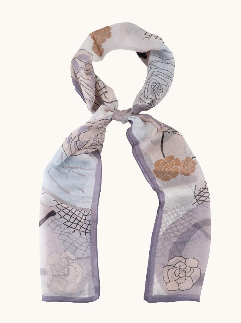 Jedwabny szal w stonowanej kolorystyce doskonale uzupełnia eleganckie i minimalistyczne stylizacje.Świetnie wygląda w zestawieniu z klasycznym płaszczem, marynarką, swetrem z kaszmiru lub prostą sukienką.