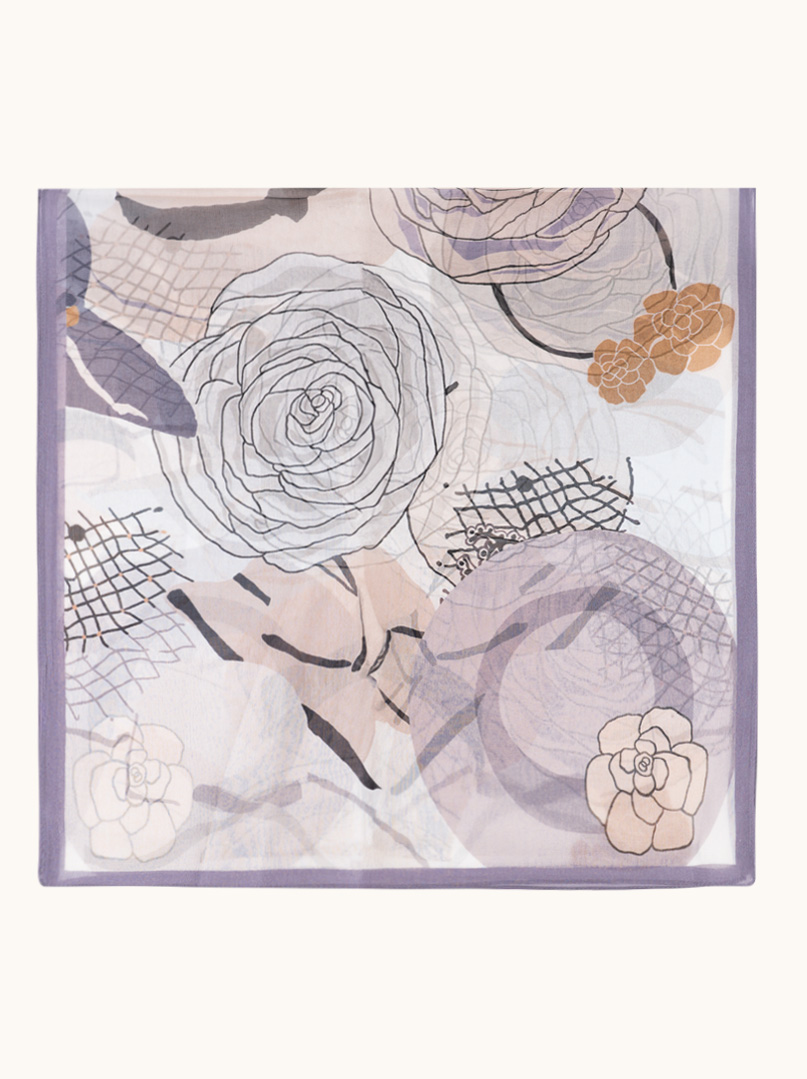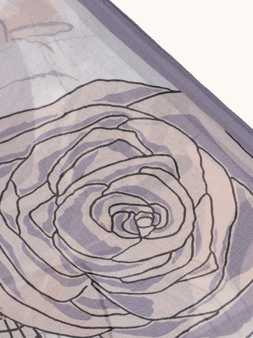 Artystyczny wzór z dużymi, szkicowymi różami oraz geometrycznymi detalami nadaje tkaninie wyjątkowego charakteru.Subtelna, przygaszona kolorystyka sprawia, że szal jest niezwykle uniwersalny i łatwo dopasować go do wielu stylizacji –od codziennych po bardziej eleganckie.
