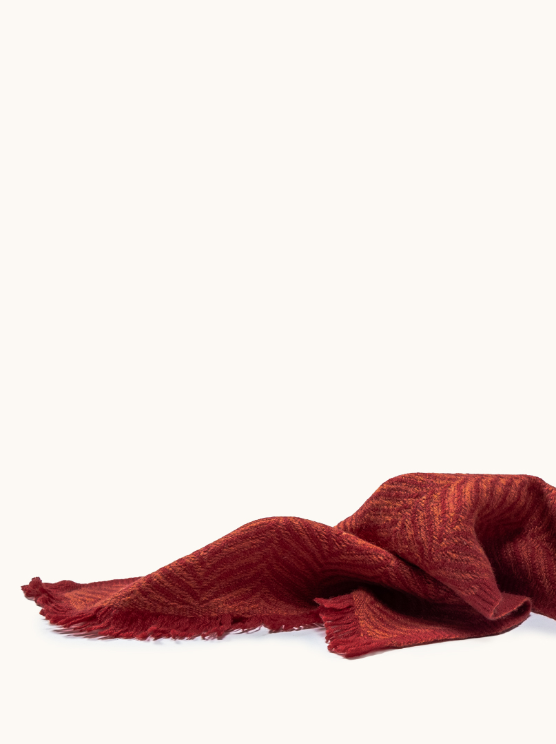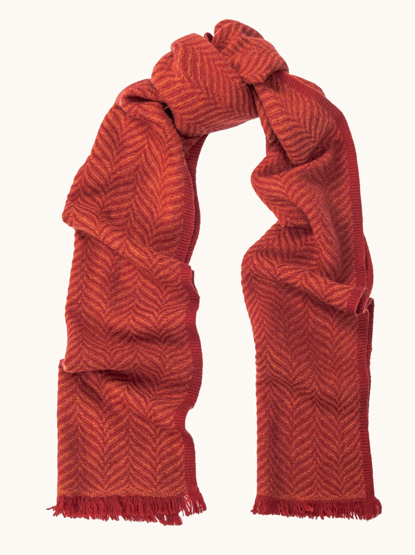 Strukturalny wzór jodełki nadaje szalowi głębi i charakteru, subtelnie podkreślając jego luksusowy wygląd. Ceglasta kolorystyka z rdzawą nutą dodaje stylizacjom ciepła i wyrazistości, pozostając jednocześnie elegancka i łatwa do zestawienia z klasyczną garderobą. Delikatne frędzle na zakończeniach podkreślają tradycyjny charakter szala i dodają mu lekkości.