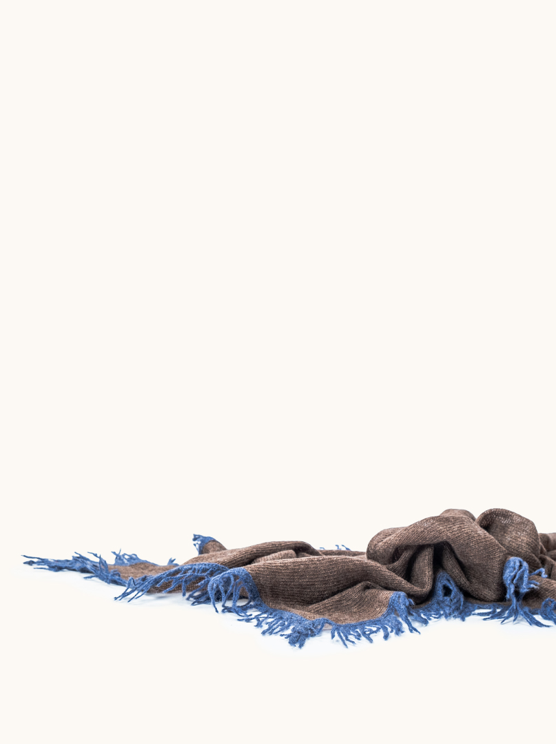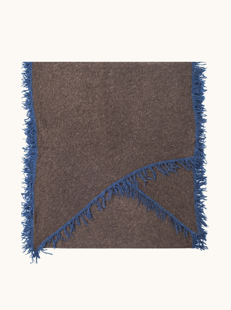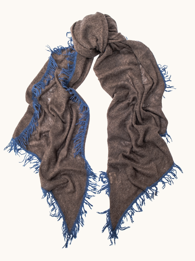 Szal wykonany w 100% z najwyższej jakości kaszmiru to połączenie ponadczasowej elegancji i nowoczesnego detalu. Subtelny, melanżowy brąz został przełamany kontrastową niebieską lamówką oraz frędzlami, które nadają całości wyrazisty, ale wciąż bardzo szlachetny charakter.