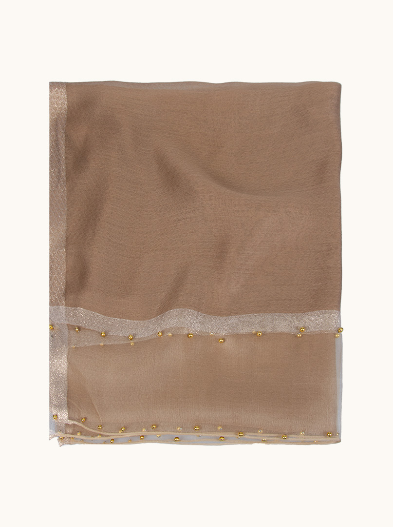 Szlachetny odcień beżu w połączeniu ze złotą obwódką i subtelnymi koralikami tworzy efekt niezwykle elegancki i dopracowany. To wizytowy szal, który przyciąga spojrzenia detalem, a nie przesadą.