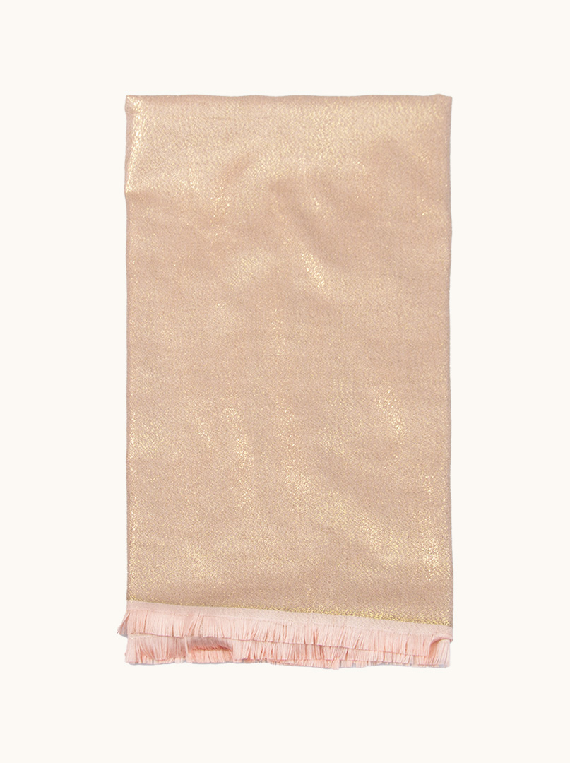 Złoto-beżowy odcień z subtelnym połyskiem tworzy efekt elegancki, ciepły i niezwykle kobiecy. To wizytowy szal, który pięknie odbija światło i dodaje stylizacji delikatnego blasku.