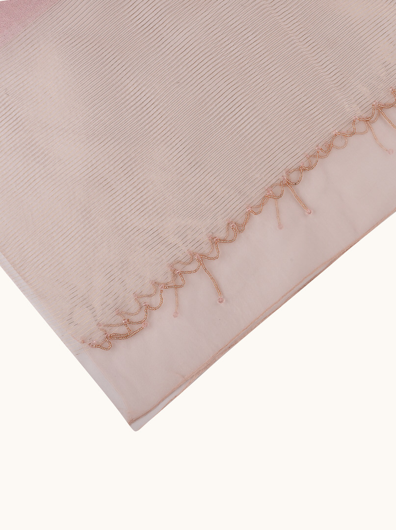 Ten kolorze różowym z brokatowym wykończeniem łączy w sobie miękkość wełny i lekkość jedwabiu, tworząc subtelnie połyskującą, elegancką tkaninę idealną na chłodniejsze dni i wieczorne wyjścia. Górna część jest matowa i otulająca, dolna — delikatnie transparentna, z cienkimi, połyskującymi liniami, które dodają szalowi lekkości i wyrafinowanego charakteru.