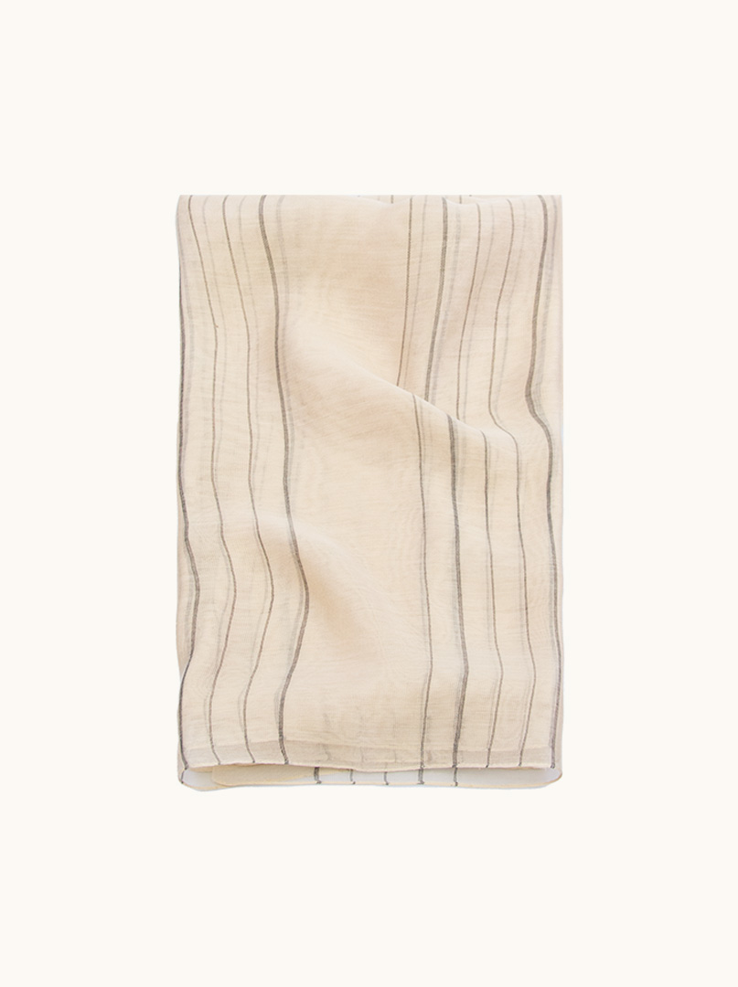 Minimalistyczny, a jednocześnie wyrazisty. Beżowy szal w czarne paski to klasyka, która nigdy nie wychodzi z mody.