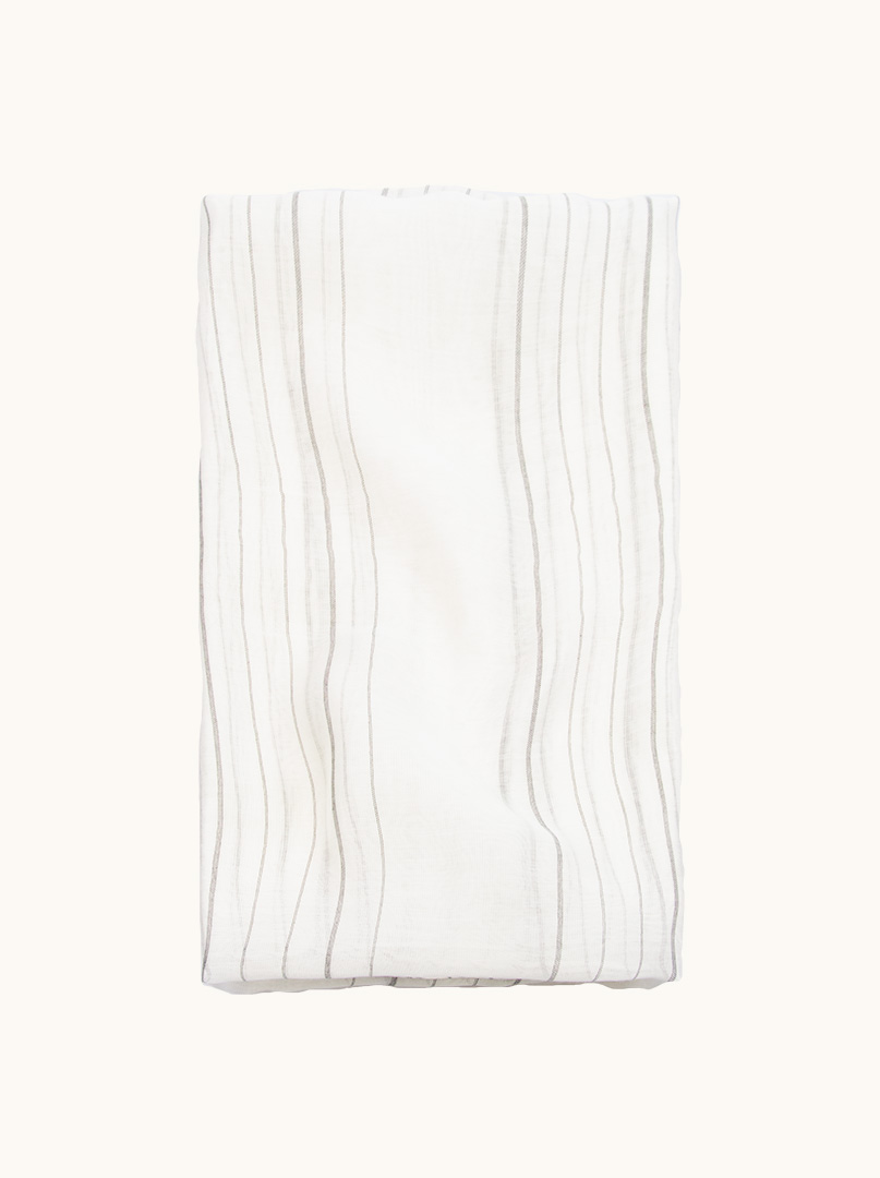 Subtelny, świeży i ponadczasowy. Biały szal w delikatne czarne paski to esencja minimalistycznej elegancji.