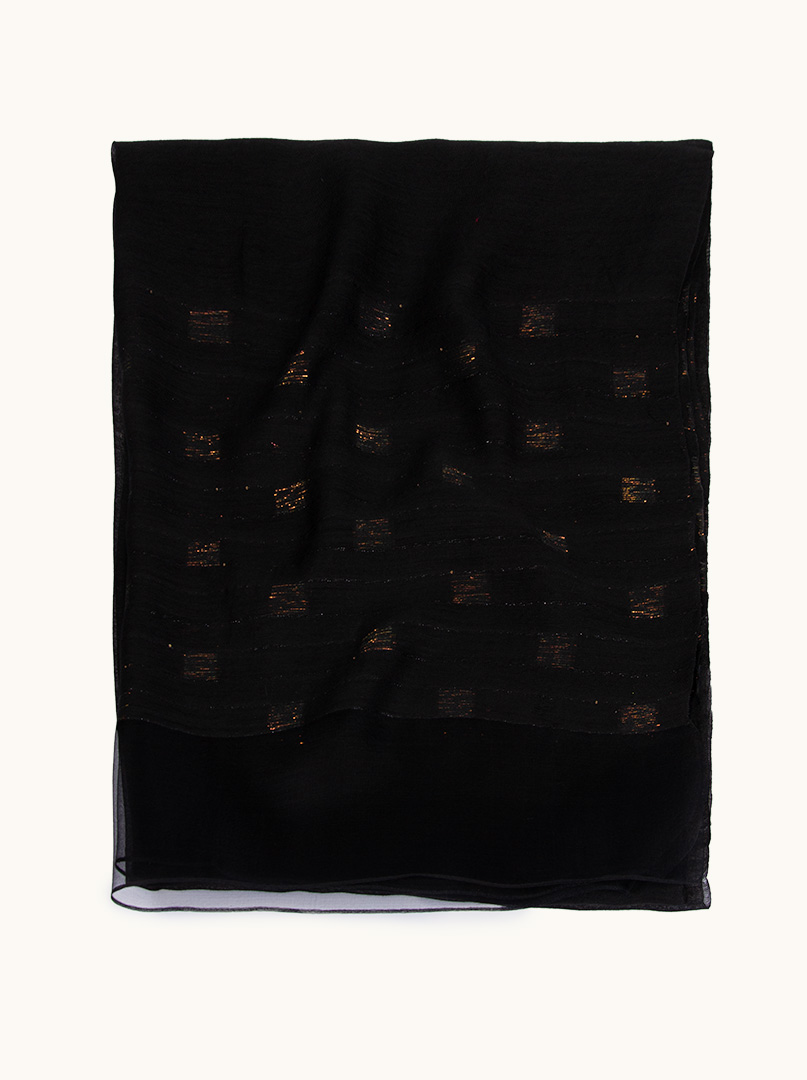 Klasyczna czerń w połączeniu z delikatnymi, połyskującymi elementami tworzy efekt elegancki i wyrafinowany. To szal, który podkreśla stylizację i dodaje jej subtelnego blasku.