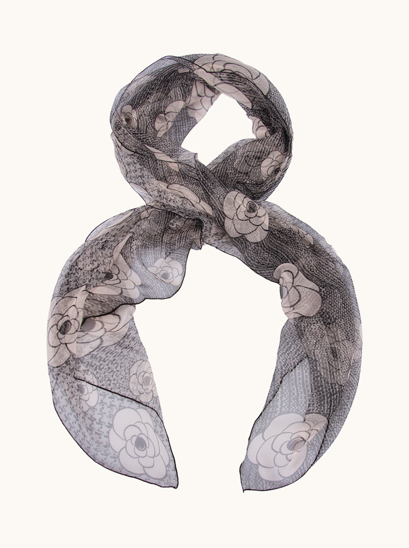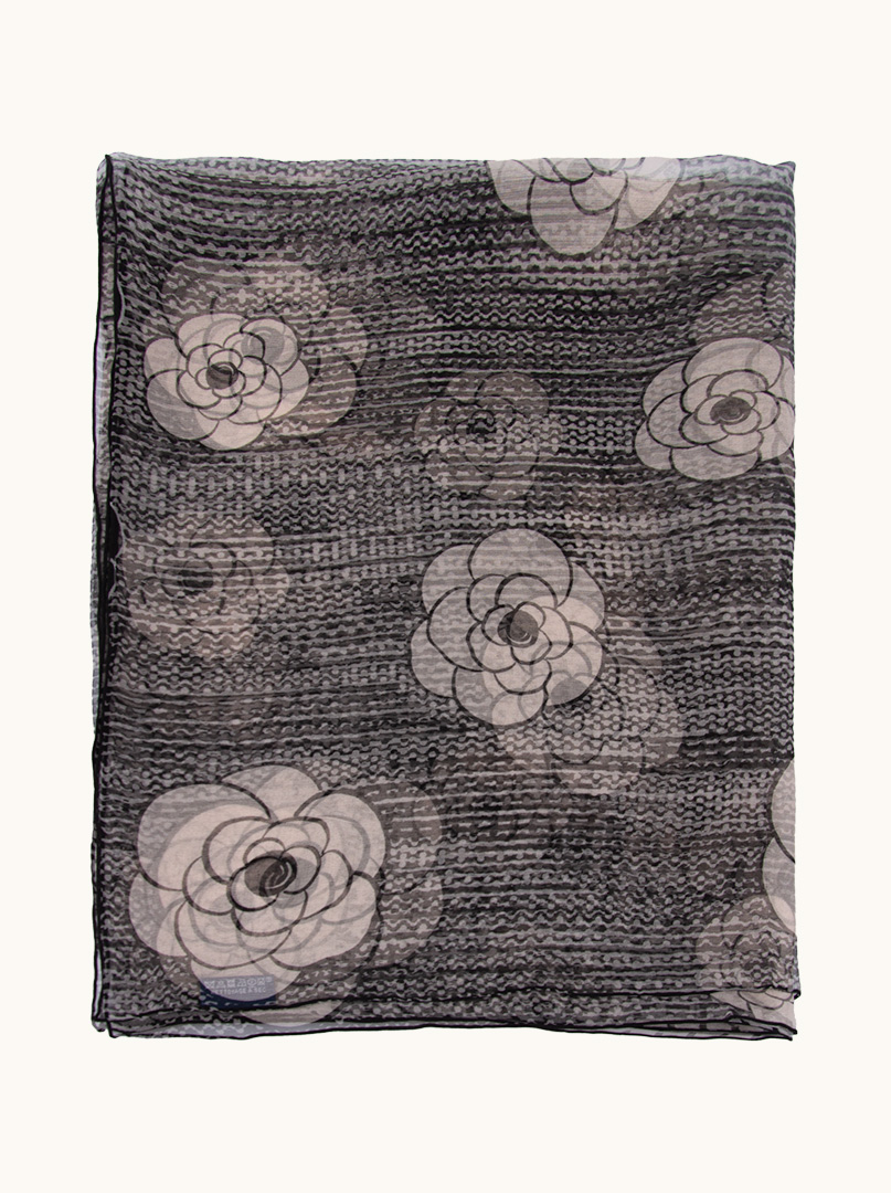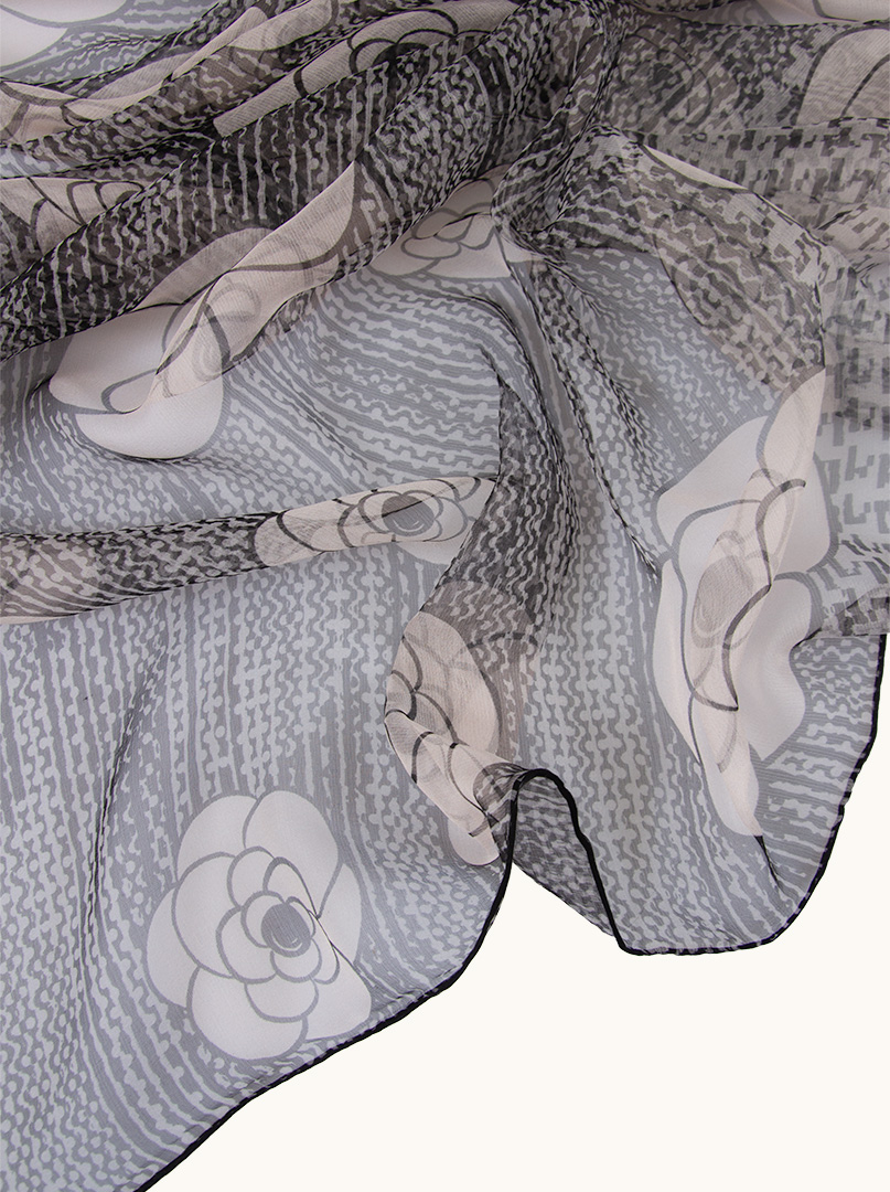 Delikatny, cieniutki, jak mgiełka szal z jedwabnej krepy, tkaniny o charakterystycznej fakturze, która jest lekka, miękka i ma subtelny połysk. Jedwab ten jest również przewiewny i komfortowy w noszeniu. Wzór kwiatowy jest klasyczny i elegancki, często kojarzony z luksusowymi tkaninami, dodaje tekstury i głębi, czyniąc szal bardziej wyrafinowanym. Można go nosić do pracy, na spotkania biznesowe, jak i na bardziej formalne wydarzenia.